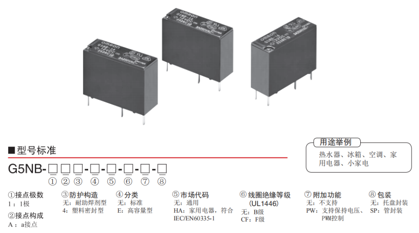 G5NB功率繼電器具有耐沖擊電壓10KV的1極3A/5A開閉的小型繼電器,采用了高功率電磁回路,實(shí)現(xiàn)了高靈敏(200mW),標(biāo)準(zhǔn)品還取得了UL、CSA、VDE認(rèn)證,在使用上符合EN61010強(qiáng)化絕緣標(biāo)準(zhǔn),還支持保持電壓、PWM控制,有助于節(jié)能(G5NB-( )-PW型)