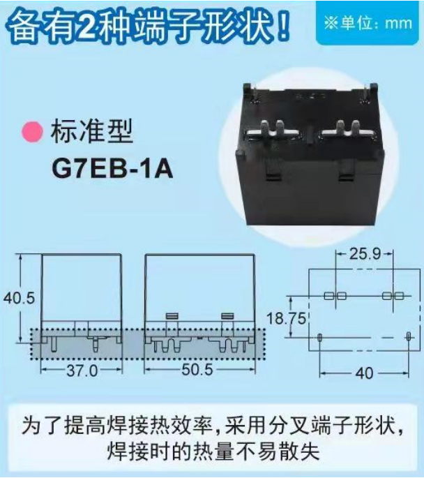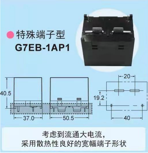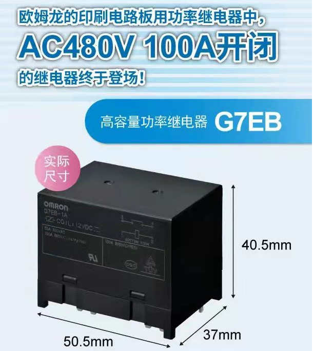 歐姆龍繼電器G7EB系列聚大容量與高功率兼具的功率繼電器,實(shí)現(xiàn)AC480V 100A開(kāi)閉,而實(shí)際尺寸僅50.5mm(長(zhǎng))*37(寬)*40.5(高),并備有2種端子形狀。