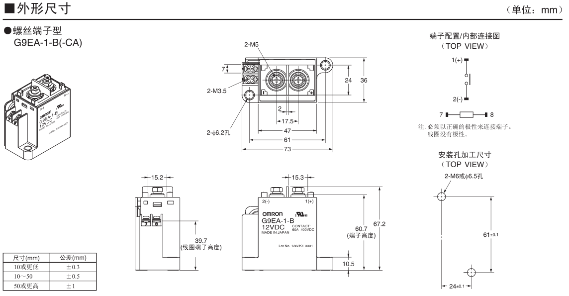 高67.2mm×寬36mm×長73mm的小型繼電器,可以開關DC400V 60A。(最大可切斷DC300V 600A)