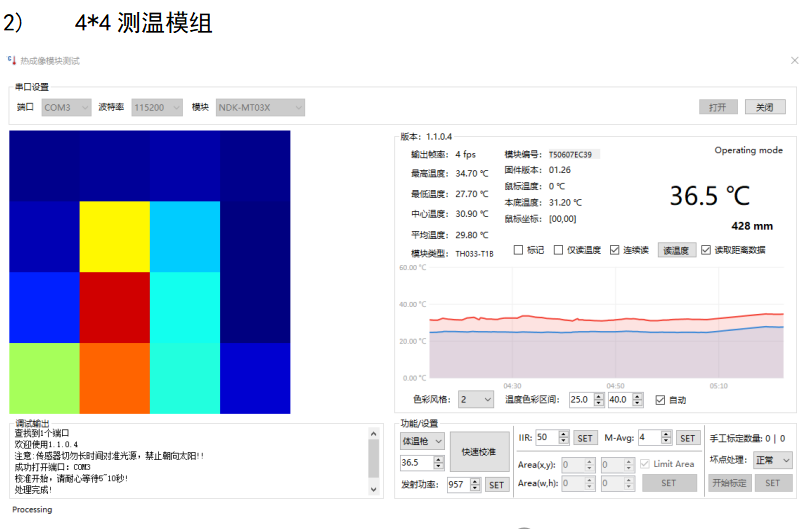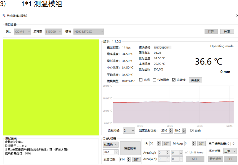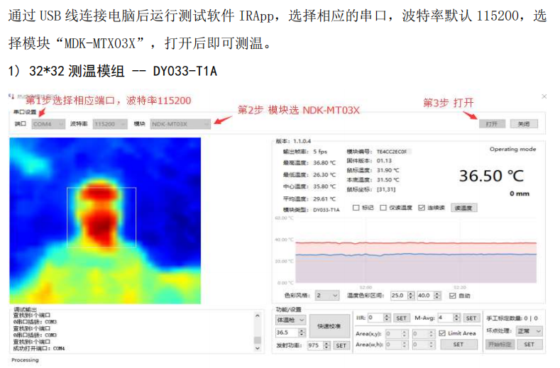 采用串口通信協(xié)議,波特率默認(rèn)115200,8數(shù)據(jù)位,1停止位,無校驗。其中用戶控制端是主機(jī),測溫模組是從機(jī),采用一發(fā)一收。協(xié)議輸出數(shù)據(jù)有兩種查詢命令方式,一是只查詢?nèi)梭w溫度,二是查詢陣列溫度數(shù)據(jù)。