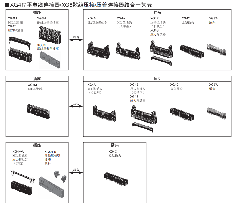 將本公司的散線壓接/壓著接器(XG5)插頭(XG8)與PCB型(XG2)組合使用可實現(xiàn)種類豐富的各種封裝。